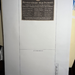 Photo of the display and close up details of the information. Pending May 2024 Dedication in the Church Cemetery, headstone monument and plaque honor the 16 Revolution War Veterans.