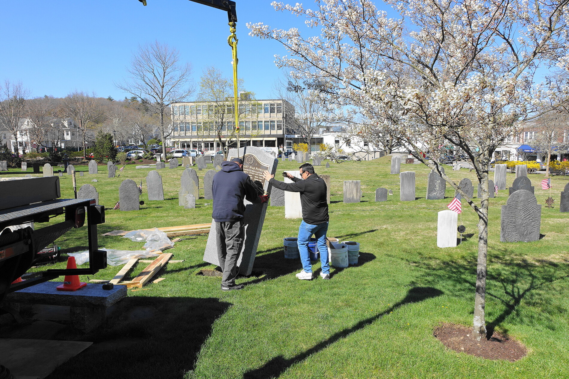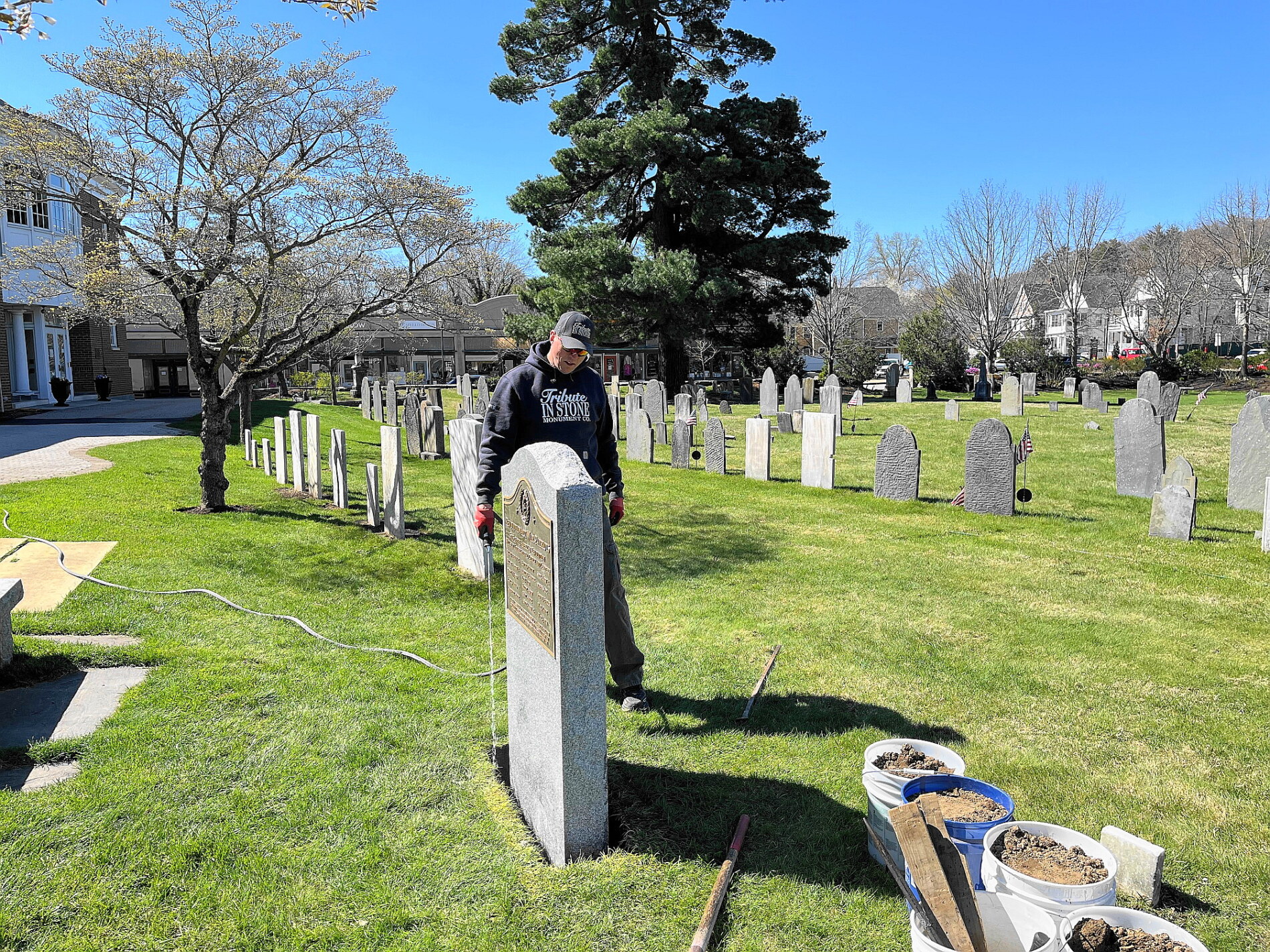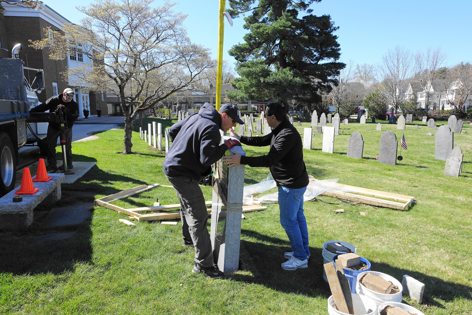 Photo #2 - Church reception Group Photo at the Cemetery May 19, 2024 during the Veterans Parade, the monument to the War Veterans of American Revolution and members in Continental Army uniform, Massachusetts Col. Henry Knox Regimental Color Guard.