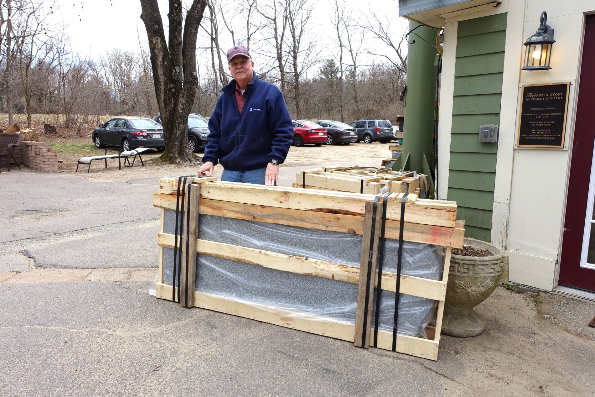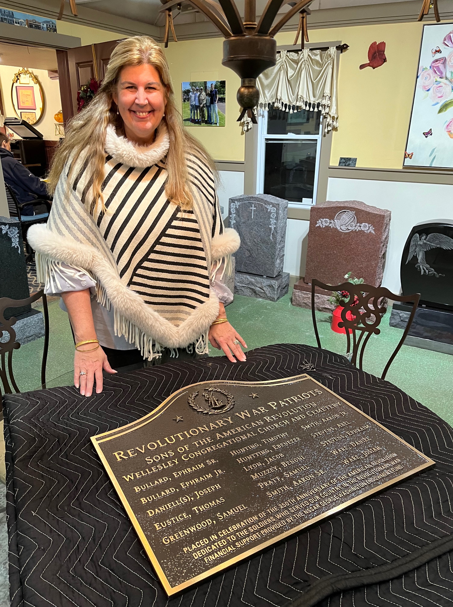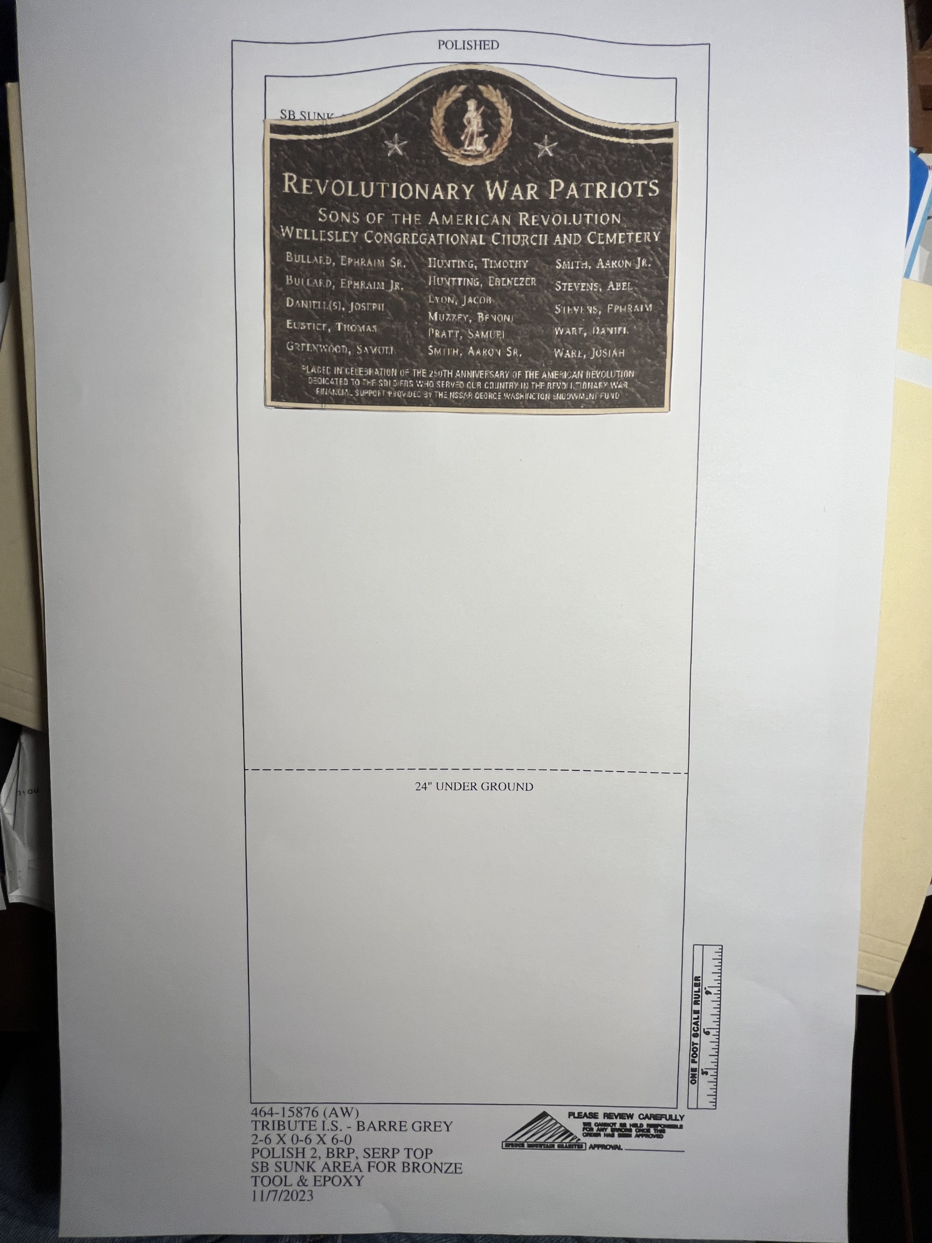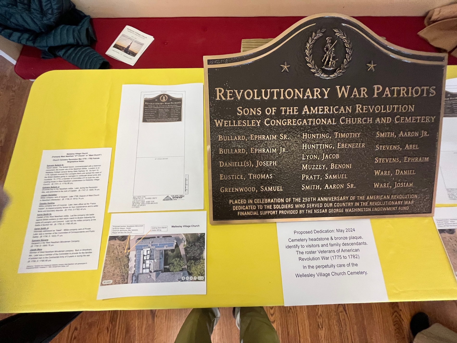 Photo of the display and close up details of the information. Pending May 2024 Dedication in the Church Cemetery, headstone monument and plaque honor the 16 Revolution War Veterans.