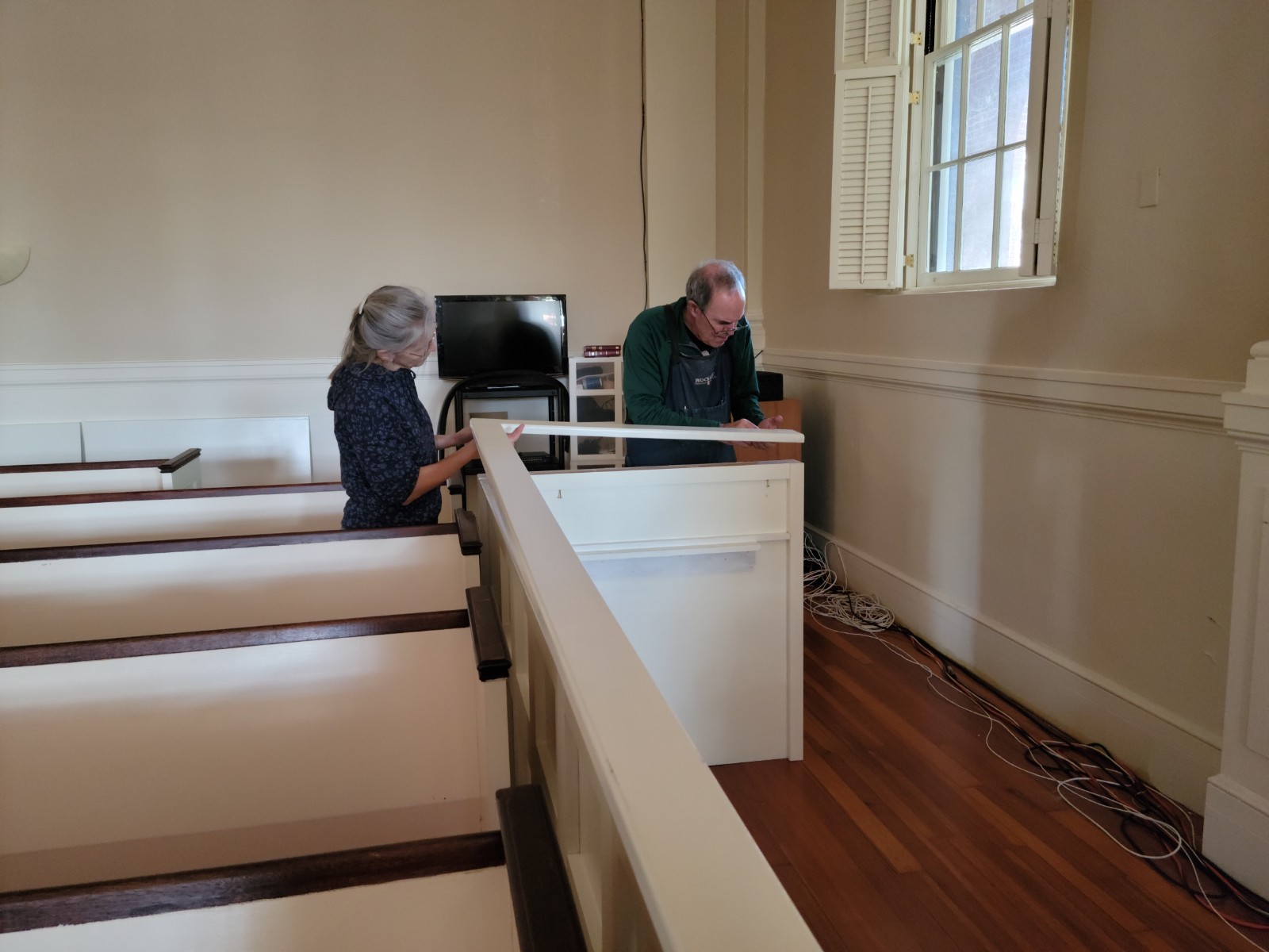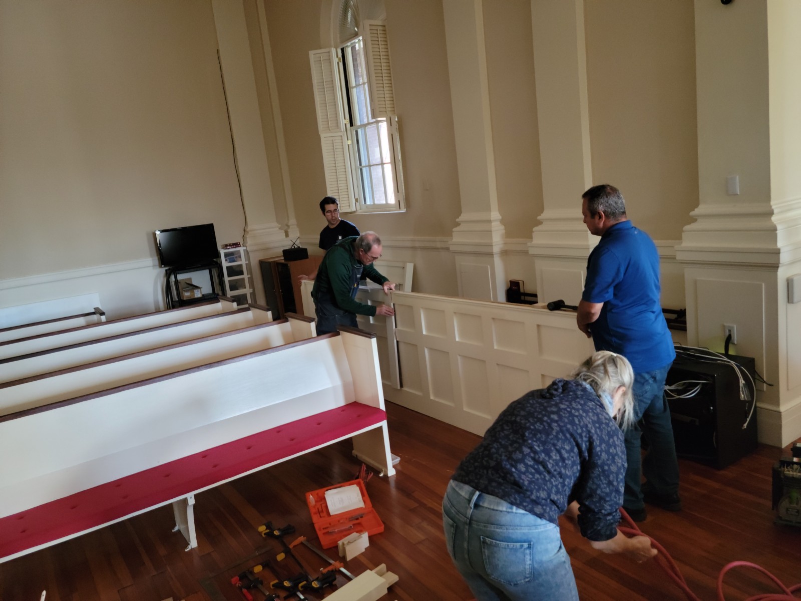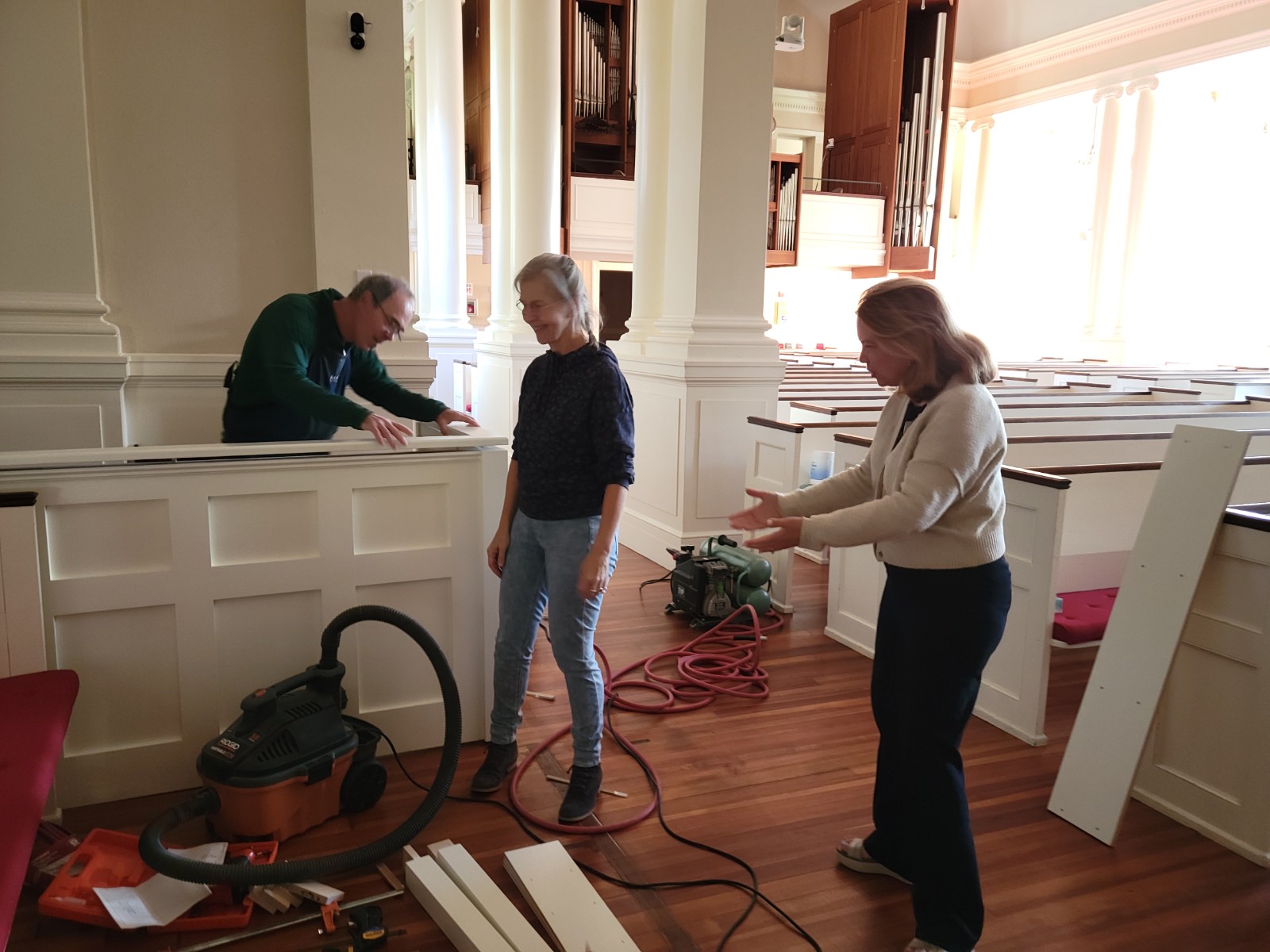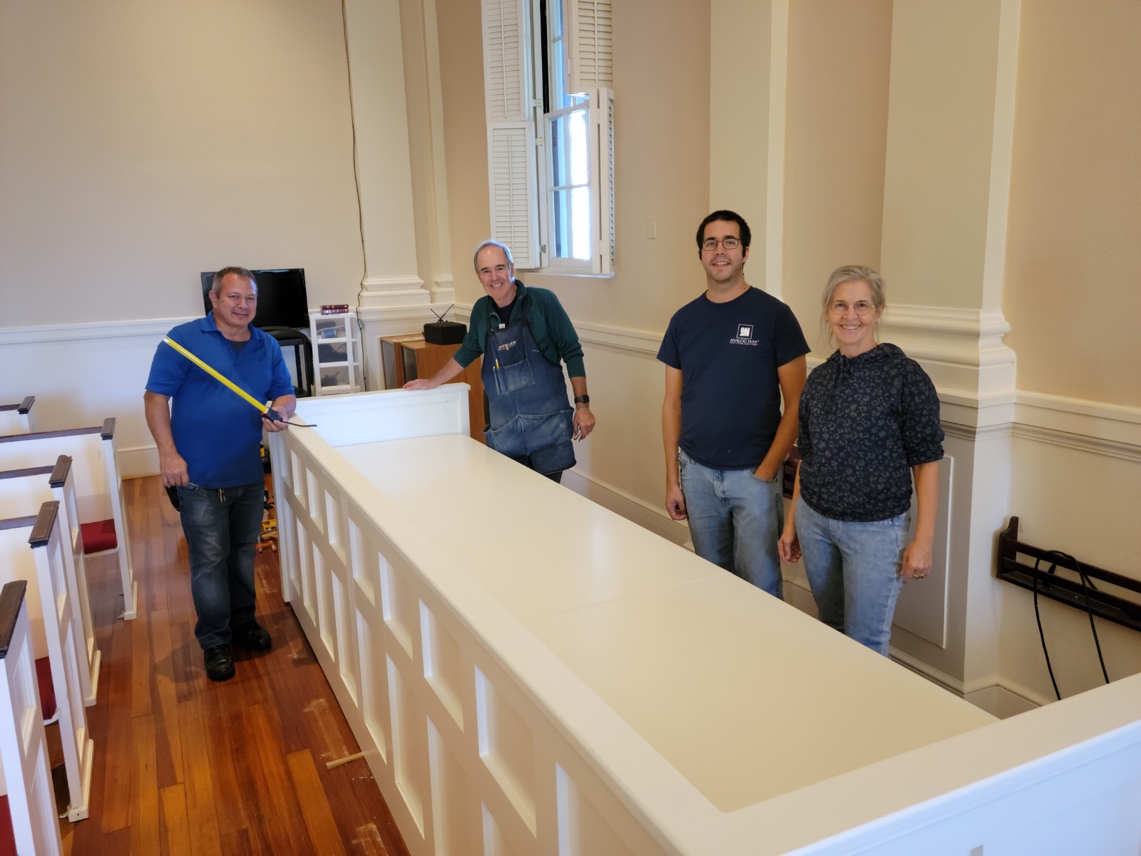 A very special thank you to church members Craig Stirrat and Charles Kounakowitch for masterfully designing, custom crafting and installing the beautiful new custom built media desk in the Sanctuary Friday, September 23rd. With help from Charles' mother Patricia visiting from France, as well as Gerardo Ortiz, the church sexton, and Chris Toppin, the church pews were carefully measured and moved so the new beautiful media desk could be assembled and installed for the audio/video team who have been livestreaming the worship services sitting behind a card table since the summer of 2021.