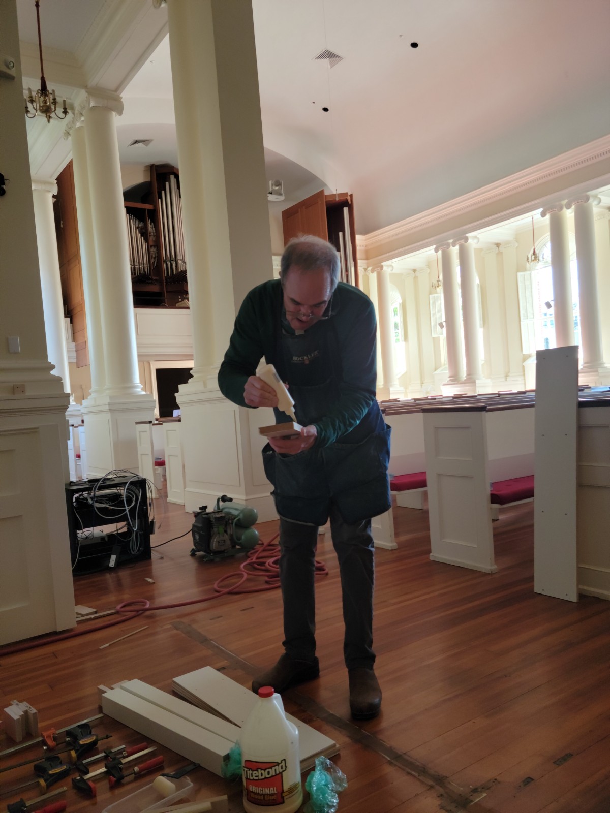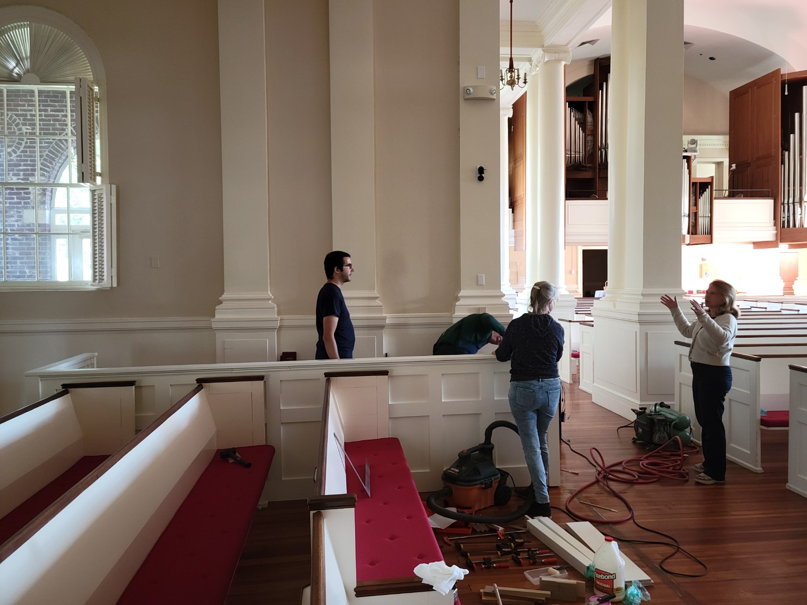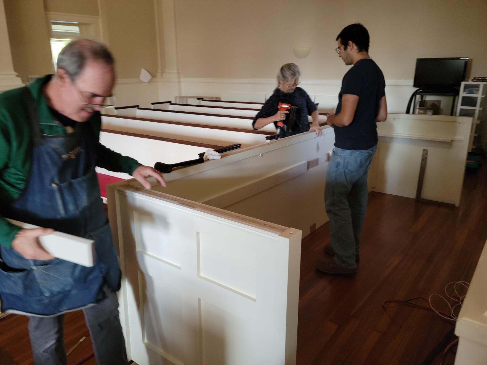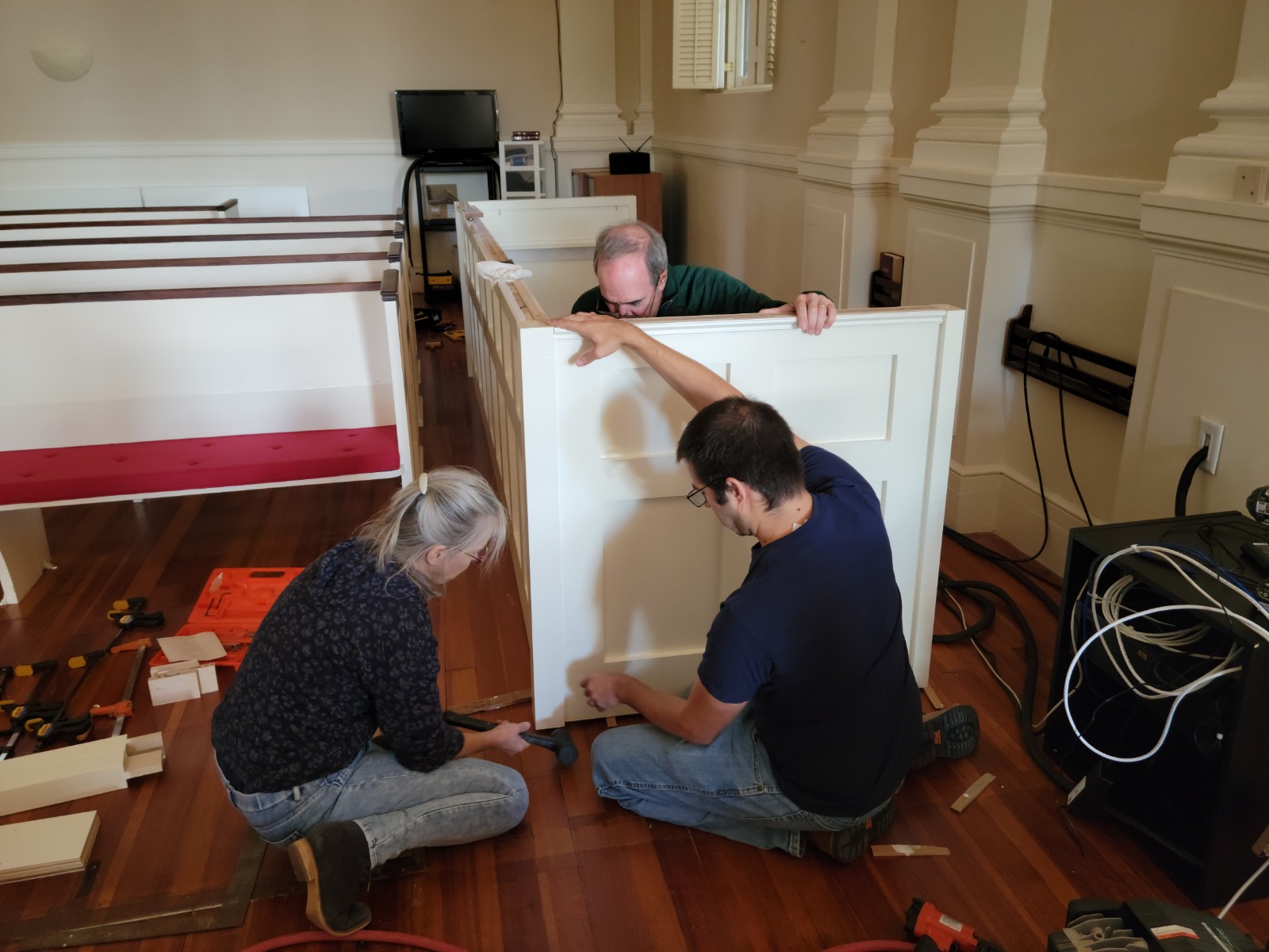 A very special thank you to church members Craig Stirrat and Charles Kounakowitch for masterfully designing, custom crafting and installing the beautiful new custom built media desk in the Sanctuary Friday, September 23rd. With help from Charles' mother Patricia visiting from France, as well as Gerardo Ortiz, the church sexton, and Chris Toppin, the church pews were carefully measured and moved so the new beautiful media desk could be assembled and installed for the audio/video team who have been livestreaming the worship services sitting behind a card table since the summer of 2021.