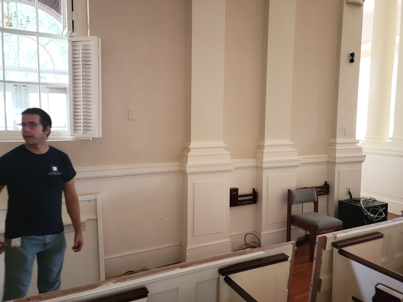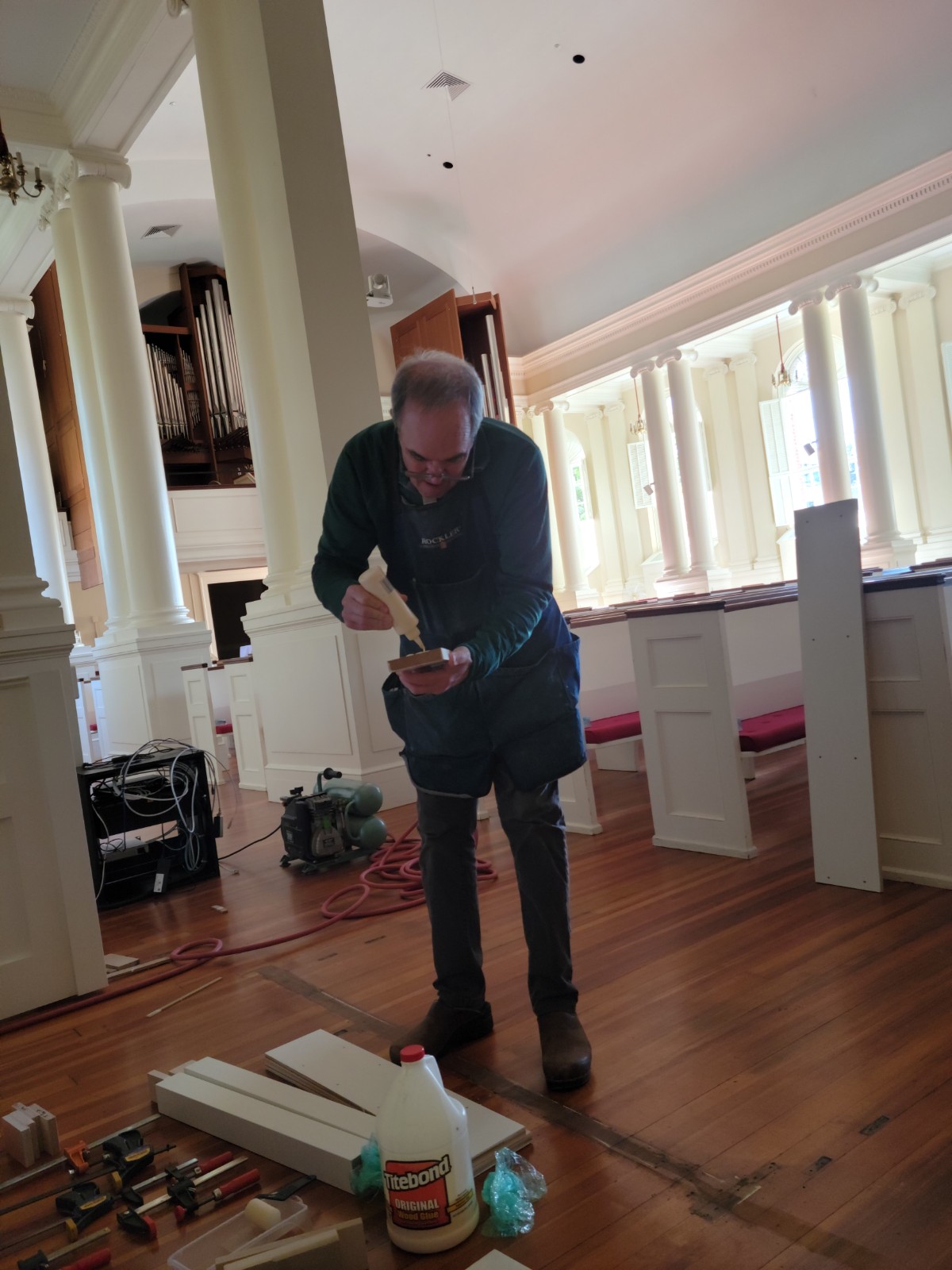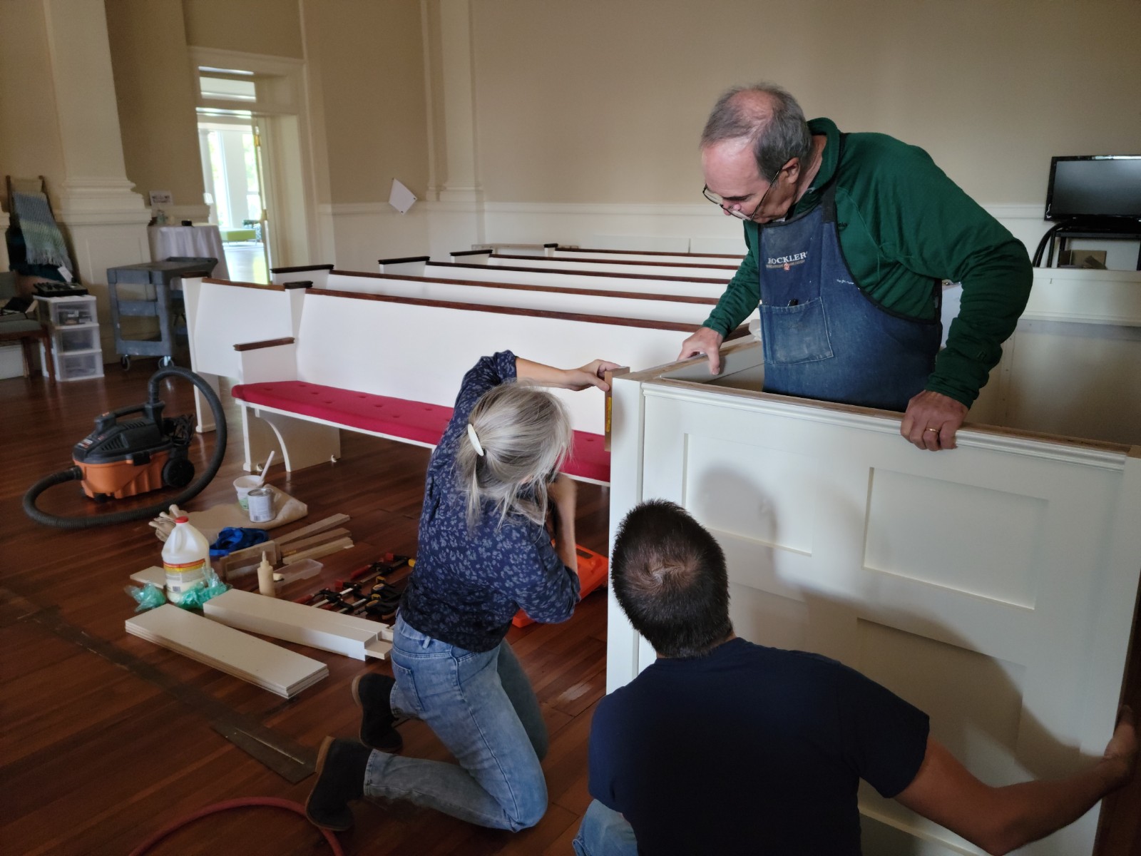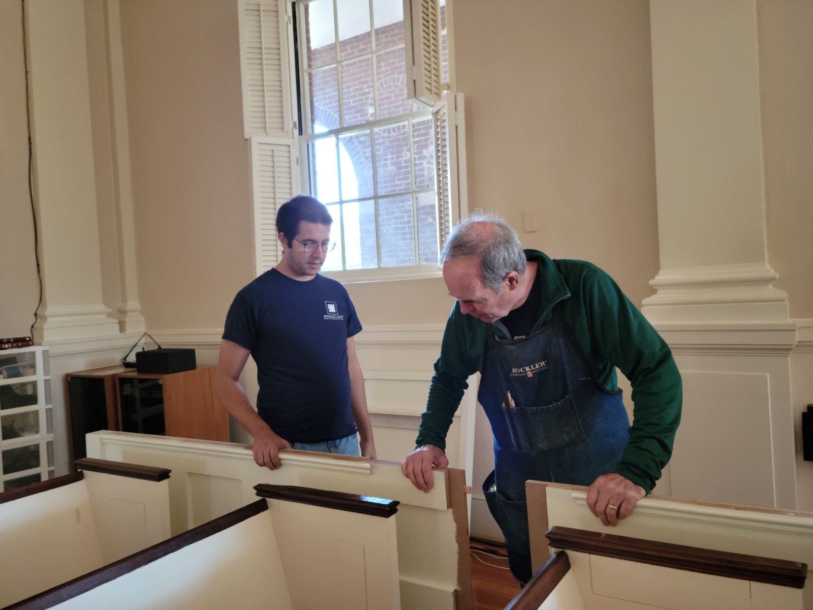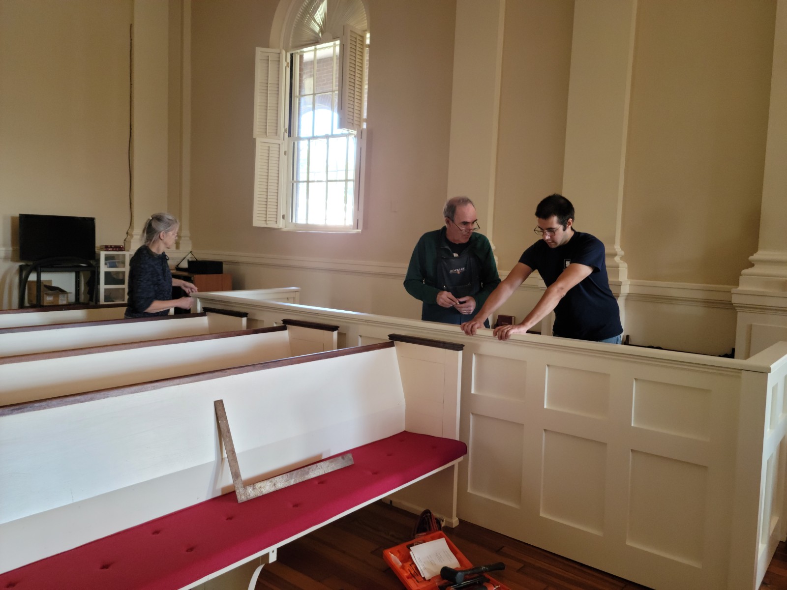 A very special thank you to church members Craig Stirrat and Charles Kounakowitch for masterfully designing, custom crafting and installing the beautiful new custom built media desk in the Sanctuary Friday, September 23rd. With help from Charles' mother Patricia visiting from France, as well as Gerardo Ortiz, the church sexton, and Chris Toppin, the church pews were carefully measured and moved so the new beautiful media desk could be assembled and installed for the audio/video team who have been livestreaming the worship services sitting behind a card table since the summer of 2021.