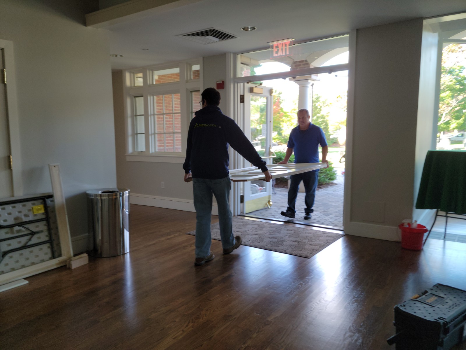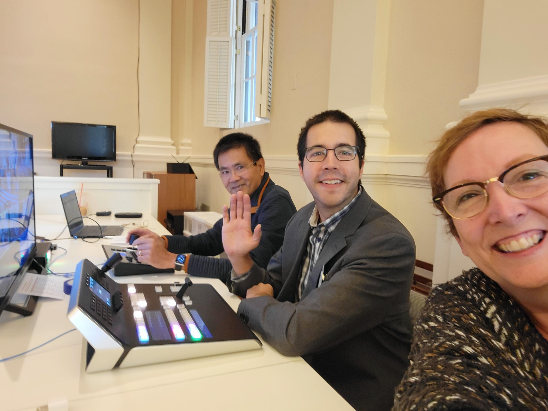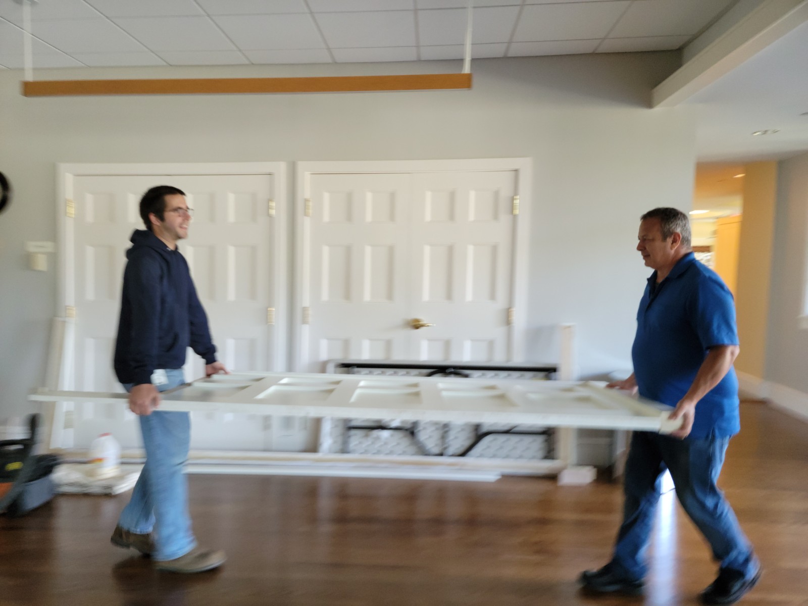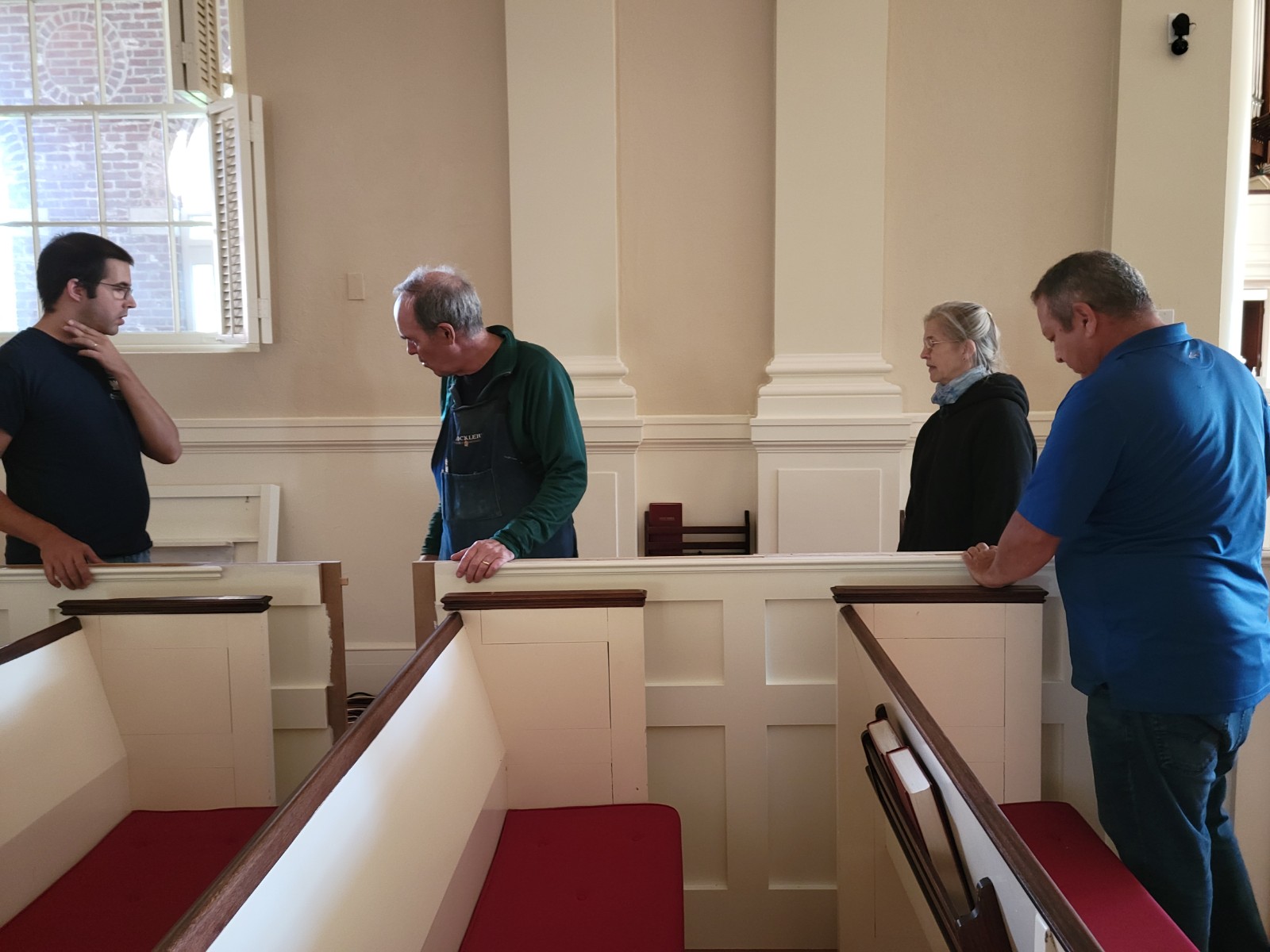 A very special thank you to church members Craig Stirrat and Charles Kounakowitch for masterfully designing, custom crafting and installing the beautiful new custom built media desk in the Sanctuary Friday, September 23rd. With help from Charles' mother Patricia visiting from France, as well as Gerardo Ortiz, the church sexton, and Chris Toppin, the church pews were carefully measured and moved so the new beautiful media desk could be assembled and installed for the audio/video team who have been livestreaming the worship services sitting behind a card table since the summer of 2021.